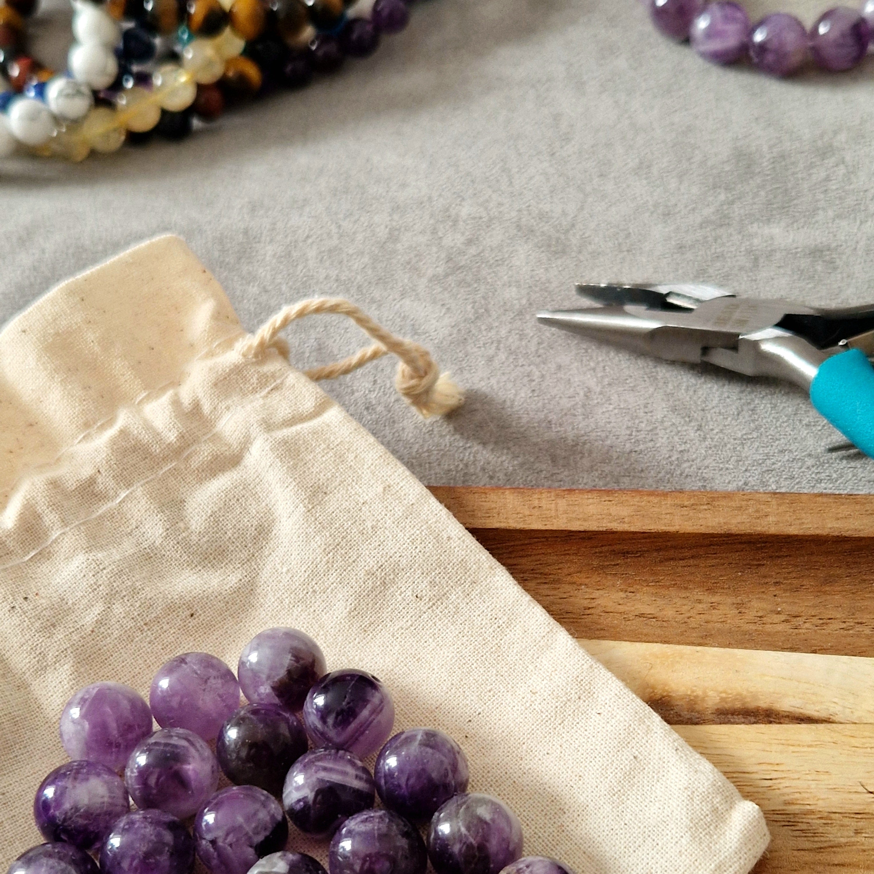 Ce bracelet sur‑mesure est bien plus qu’un accessoire : il est un allié de bien‑être. Chaque pierre est choisie pour sa résonance avec votre thème de naissance et vos besoins. L’améthyste favorise la sérénité, le quartz rose cultive l’amour, l’œil de tigre protège et la labradorite renforce la confiance, etc ... En combinant ces énergies, votre bracelet vous accompagne au quotidien, comme un talisman personnalisé.